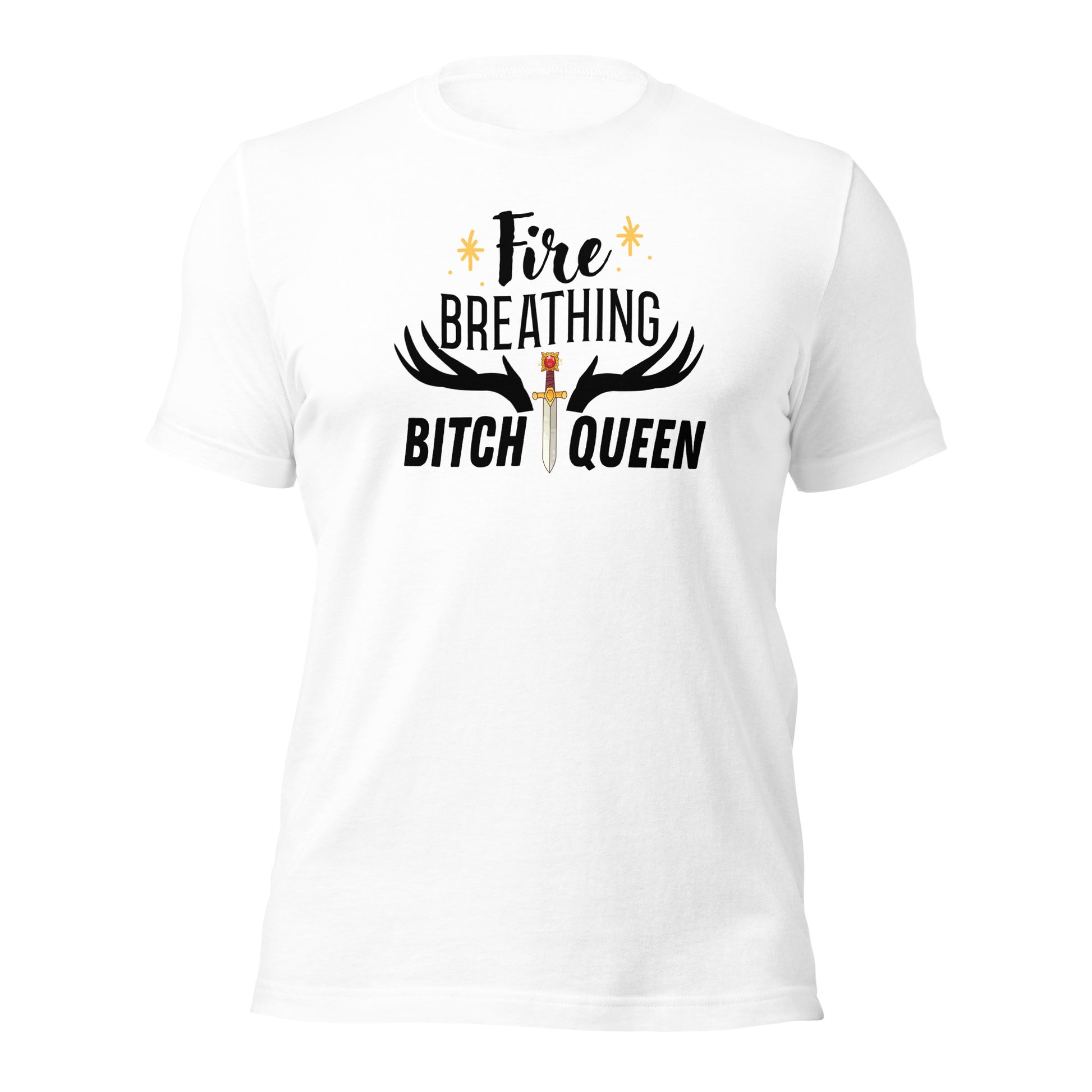 A funny T-shirt inspired by the iconic queen of fire herself, Aelin Galathynius, from Sarah J Maas' Throne of Glass series. Bold lettering across the chest with the quote "fire breathing bitch queen" along with antlers, for the Lord of the North, and the Aelin's sword, Goldryn.