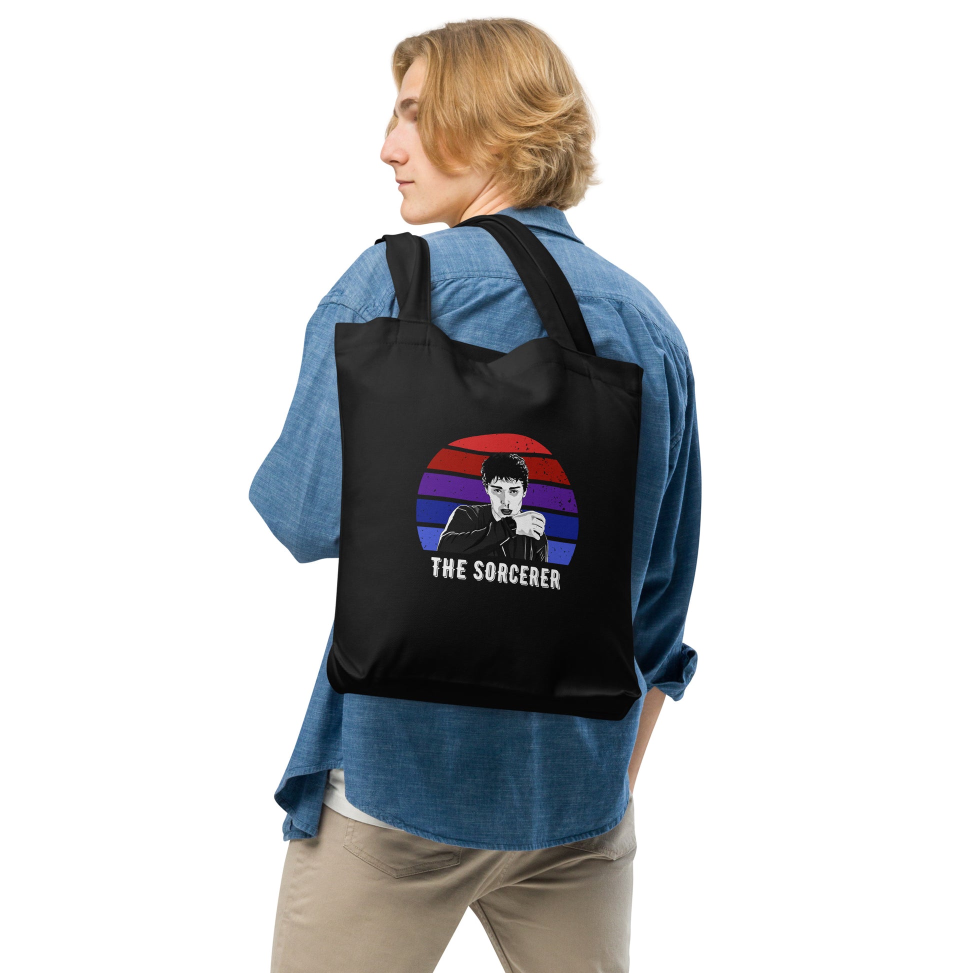 A black cotton canvas tote bag with the quote "The Sorcerer" under an image of Will Byers from stranger things season 5 episode 4 where he has a nosebleed after killing the Demogorgons. A perfect gift for stranger things lovers! Bag inspired by the stranger things series.